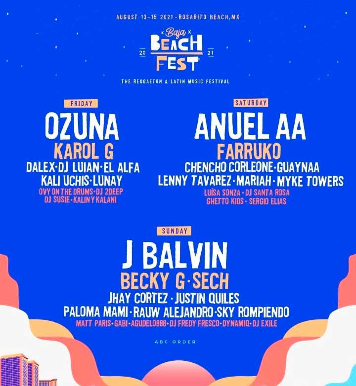 En la edición 2021 del Baja Beach Fest, en la que no se respetaron las medidas se seguridad sanitaria pese a la tercera ola de contagios por el Coronavirus, los invitados estelares fueron Ozuna, Karol G, Anuel AA, Farruko, J Balvin, Becky G y Sech, por mencionar algunos.
