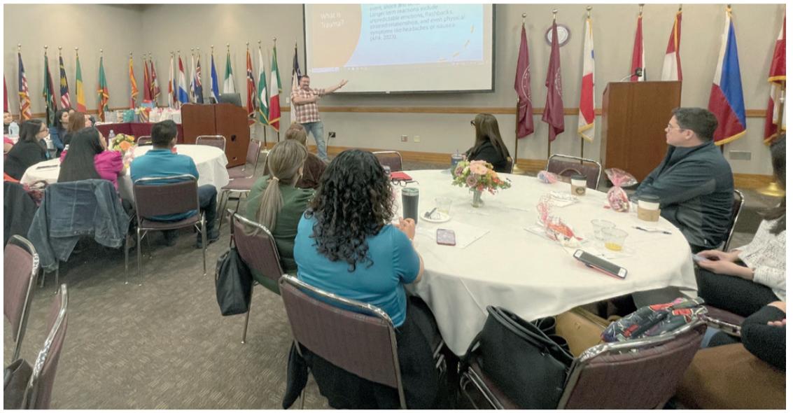Salinas explicó cómo las experiencias infantiles adversas tienen un impacto profundo en la salud. Más de 70 consejeros locales asistieron a la Conferencia Anual de la Asociación de Consejería Fronteriza celebrada en TAMIU.