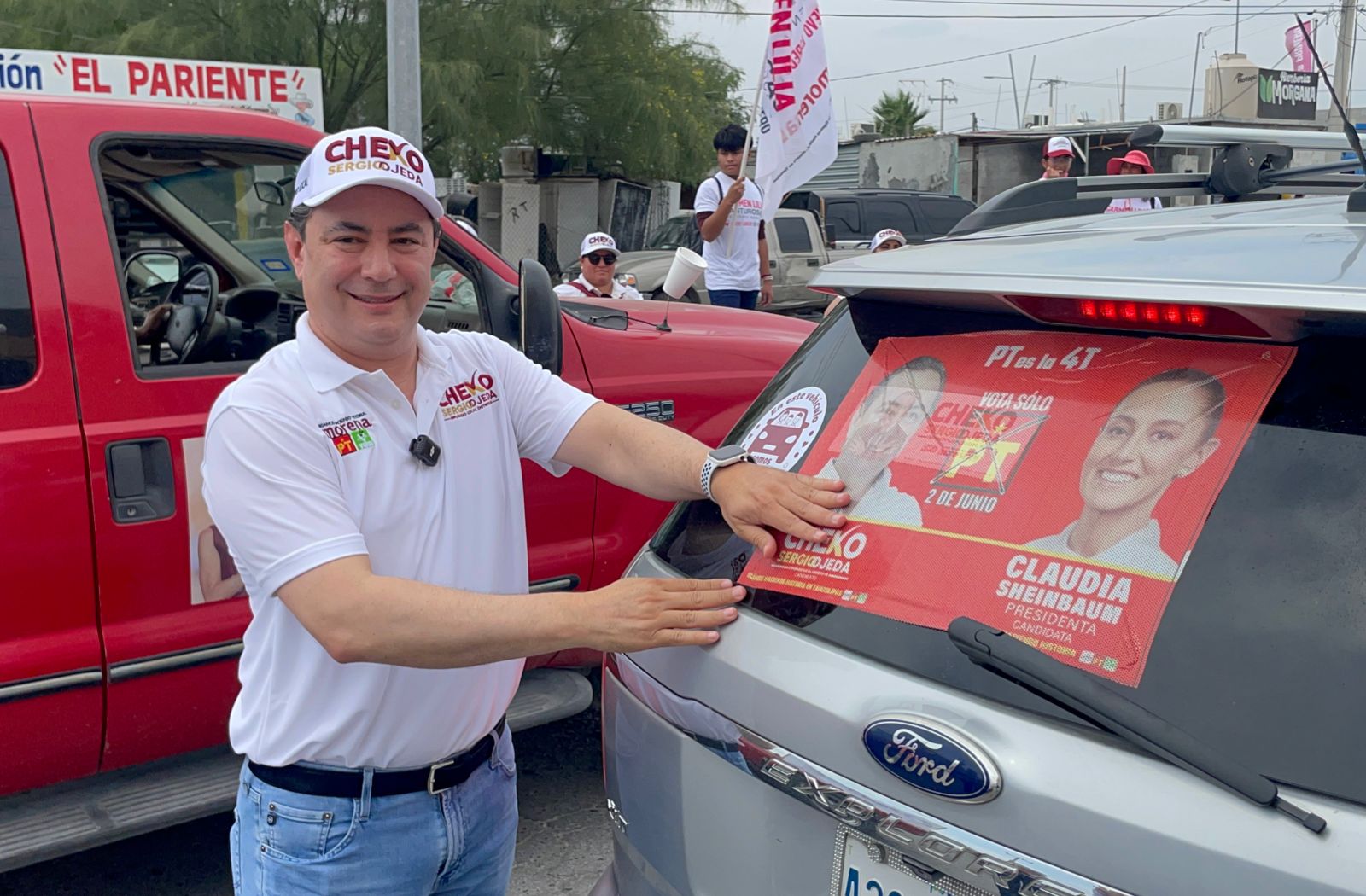 Durante el evento, se colocaron calcas y microperforados en apoyo a la candidatura de Sheinbaum, mientras “Cheko” Ojeda conversaba con los ciudadanos, reafirmando la importancia de respaldar el proyecto de nación de Morena
