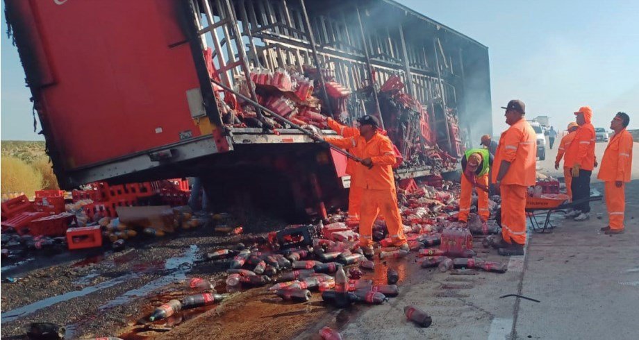 A causa de una falla en el sistema eléctrico de un camión de una empresa refresquera se registró un incendio unos 20 kilómetros antes de llegar a esta ciudad.