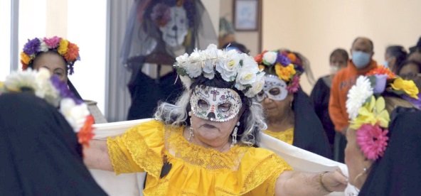 En un ambiente de fiesta, adornado con flores de cempasúchil, y al fondo el altar de muertos, el grupo de danza folclórica de la Casa Club del Adulto Activo bailaron al son de la “Llorona”.