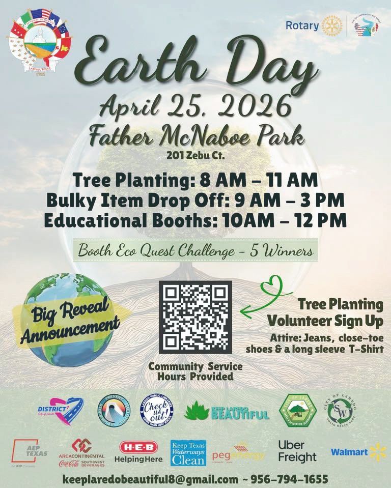 El Departamento de Medio Ambiente y Residuos Sólidos de la Ciudad de Laredo y Keep Laredo Beautiful invitan a la comunidad y medios de comunicación a asistir a la ceremonia oficial de proclamación del “Día de la Tierra” en reconocimiento al compromiso continuo de la comunidad de Laredo con la sostenibilidad y la gestión ambiental responsable.