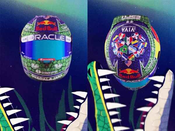 El casco, inspirado en los cocodrilos, exhibe corazones que representan las banderas de diversos países latinoamericanos, con la bandera de México en el centro. En la parte trasera, se encuentran las iniciales de Sergio Pérez y la frase tradicional «Never Give Up».