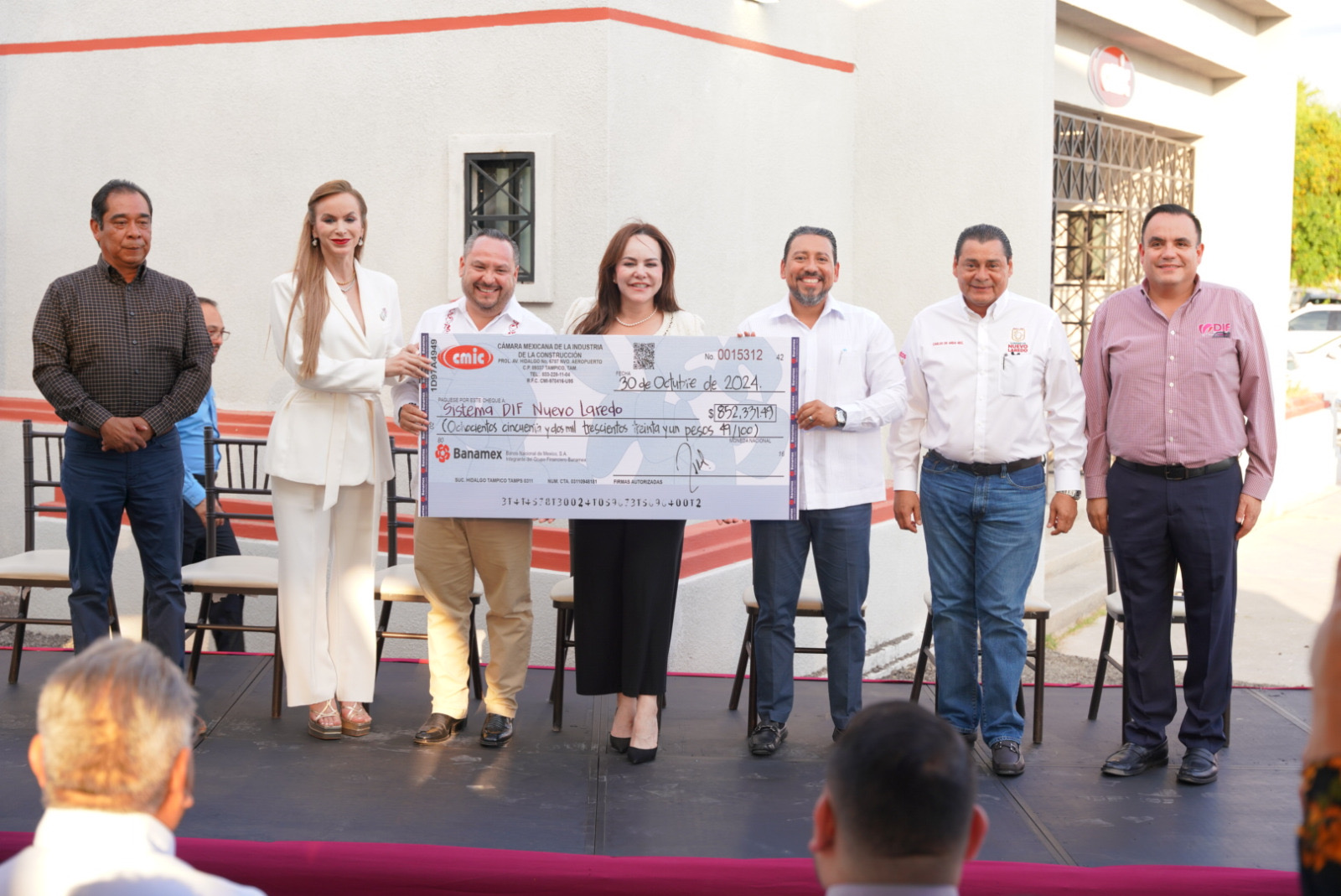 Como parte del convenio entre el Gobierno Municipal y la Cámara Mexicana de la Industria de la Construcción (CMIC), el presidente de la asociación, Pablo Eduardo Haro Panduro, entregó un cheque valuado en 852 mil 331 pesos a la alcaldesa Carmen Lilia Canturosas Villarreal y a la presidenta del Sistema para el Desarrollo Integral de la Familia (DIF), Claudette Canturosas Villarreal, para fortalecer los programas y acciones del DIF.