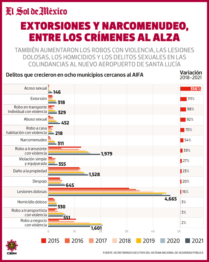 Luego de que en octubre de 2018 el gobierno del presidente Andrés Manuel López Obrador anunciara la cancelación del aeropuerto que se erigía en Texcoco y la construcción del nuevo aeródromo en las instalaciones de la base militar aérea de Santa Lucía, 14 delitos en los ocho municipios que circundan al AIFA comenzaron a crecer, según datos del Secretariado Ejecutivo del Sistema Nacional de Seguridad Pública (SESNSP).