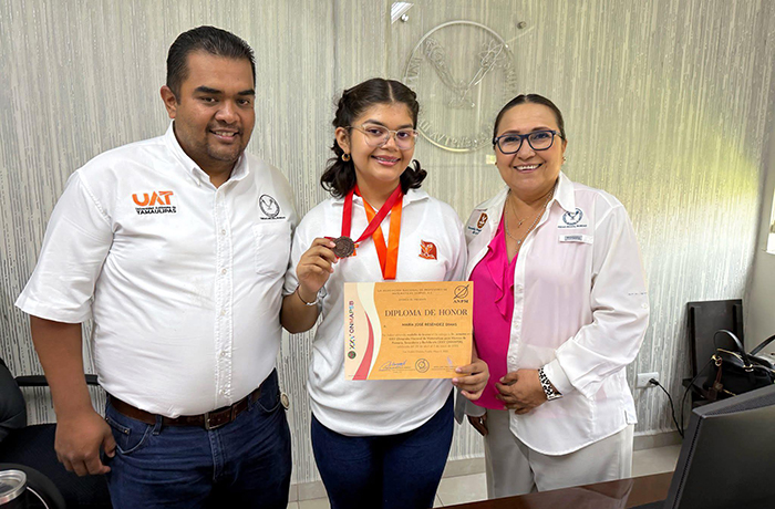 Ciudad Victoria, Tamaulipas.- A través de sus redes sociales, el rector de la UAT, Dámaso Anaya Alvarado, felicitó a María José, alumna del segundo semestre de la Escuela Preparatoria Mante, por su excelente rendimiento académico que le permitió obtener la medalla de bronce en esta competencia nacional.