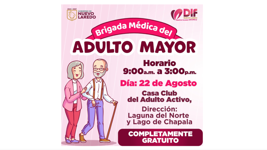 El Sistema DIF Nuevo Laredo llevará a cabo hoy, viernes 22 de agosto, una brigada especial de salud y servicios para adultos mayores, en la Casa Club del Adulto Mayor, ubicada en Laguna del Norte y Lago de Chapala, con horario de 9:00 de la mañana a 3:00 de la tarde.