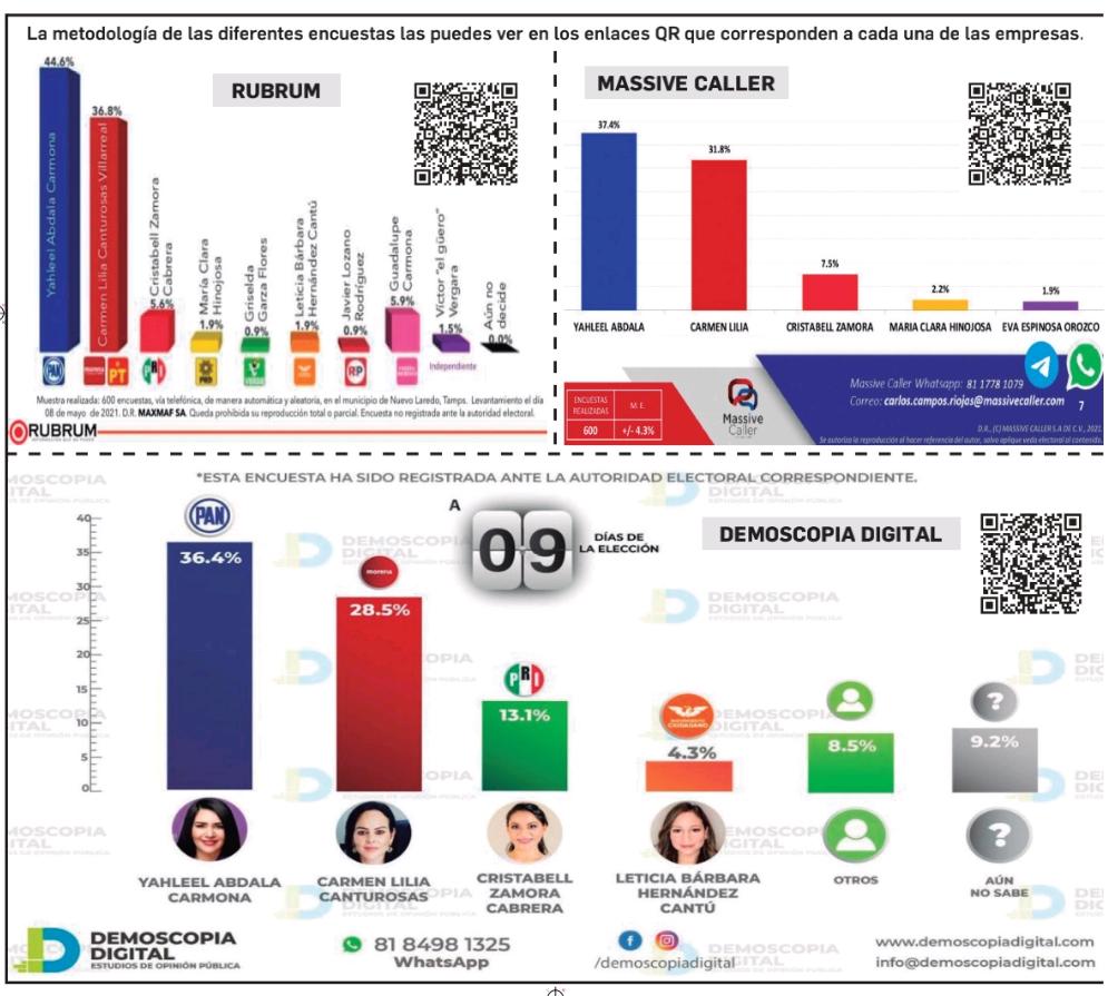 De acuerdo a 4 diferentes casas encuestadoras de nivel nacional, revelaron en sus encuestas que la candidata del Partido Acción Nacional, Yahleel Abdala Carmona, aventaja rumbo a la alcaldía de Nuevo Laredo.