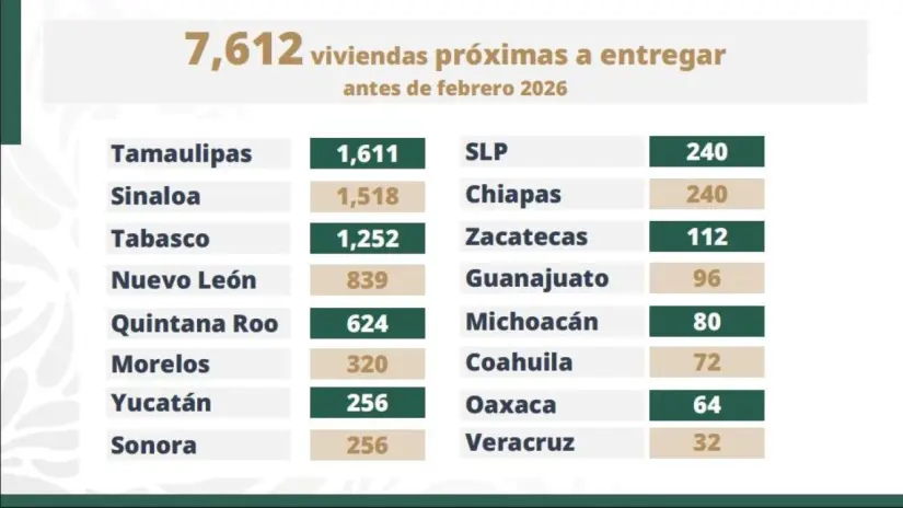 Ciudad de México.- Tamaulipas es el estado más beneficiado en el arranque del programa Vivienda para el Bienestar que impulsa la presidenta Claudia Sheinbaum, ya que de las 7 mil 612 viviendas que se entregarán antes del mes de febrero de 2026, mil 611 serán para esta entidad, como resultado del convenio de colaboración que firmó el gobernador Américo Villarreal Anaya con el director general del INFONAVIT, Octavio Romero Oropeza.