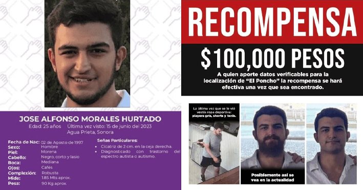 Según la autoridad judicial, el joven tiene capacidades diferentes que lo hacen propenso a la desorientación. Conocido como «Poncho», José Alfonso Morales Hurtado tiene una tez morena clara, mide aproximadamente 1.86 metros y pesa alrededor de 90 kilogramos.