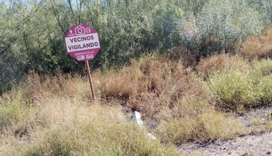 Los anuncios colocados en lotes baldíos destacan “Vecinos Vigilando”, además de que observan en el aviso una cámara fotográfica, en una advertencia entendida de que mediante imágenes pueden ser denunciados.