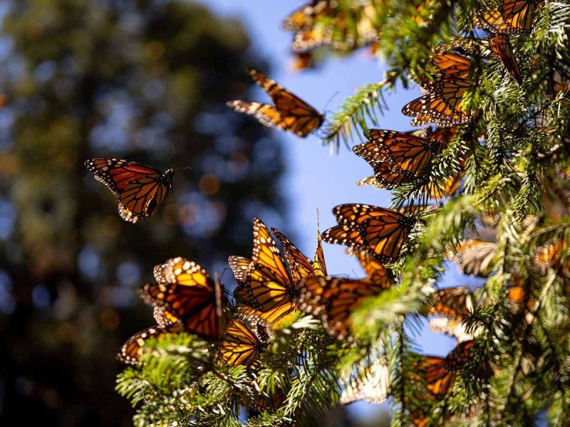 La Mariposa Monarca (Danaus plexippus) ha llegado a México después de un extenso viaje migratorio de más de cuatro mil kilómetros, cruzando Canadá y Estados Unidos. Estas mariposas están en ruta hacia los santuarios de hibernación en los bosques de pino y oyamel del Estado de México y Michoacán.