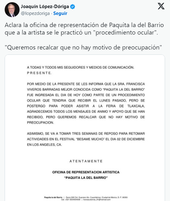Cabe mencionar que también mediante sus redes sociales Paquita la del Barrio aclaró que si bien fue ingresada a un hospital, el motivo es que tuvo un procedimiento ocular que tenía que recibir desde el lunes pasado pero se postergó.