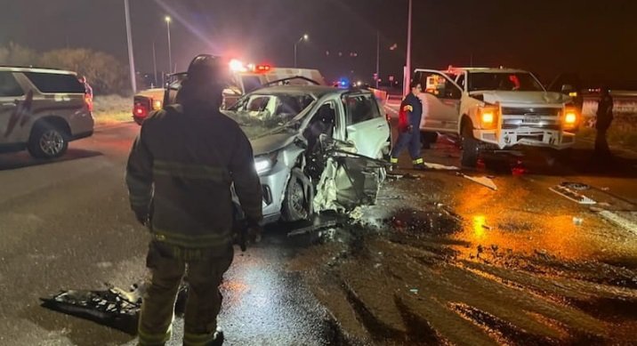 Laredo, Tx.- La cinta asfáltica de la carretera Cuatro Vientos se volvió a cubrir de sangre durante los primeros minutos de este día, al chocar brutalmente de frente una pequeña camioneta SUV y una 350 Ford F-350 reforzada, resultando gravemente lesionados un hombre de 27 años de edad y una mujer de 26, informó el Departamento de Bomberos.