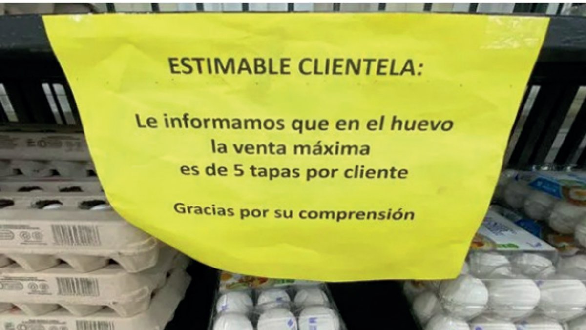 “ESTIMABLE CLIENTELA: Le informamos que en el huevo la venta máxima es de 5 tapas por cliente. Gracias por su comprensión”.