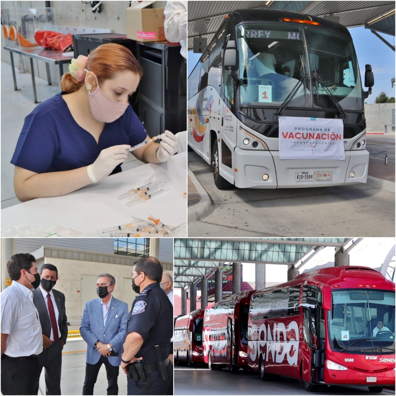 Ayer se vacunó a lo largo del día a 800 personas a bordo de 40 autobuses que llegaron, no a su máxima capacidad, algunos con poco más de 20 personas a bordo, más el operador de la unidad y 2 auxiliares de la salud, personal de salud que fue bajado a mitad de puente, ya que Laredo, Texas dijo que no los necesitaba que ahí tenían médicos para atender cualquier reacción en alguno de los inoculados.
