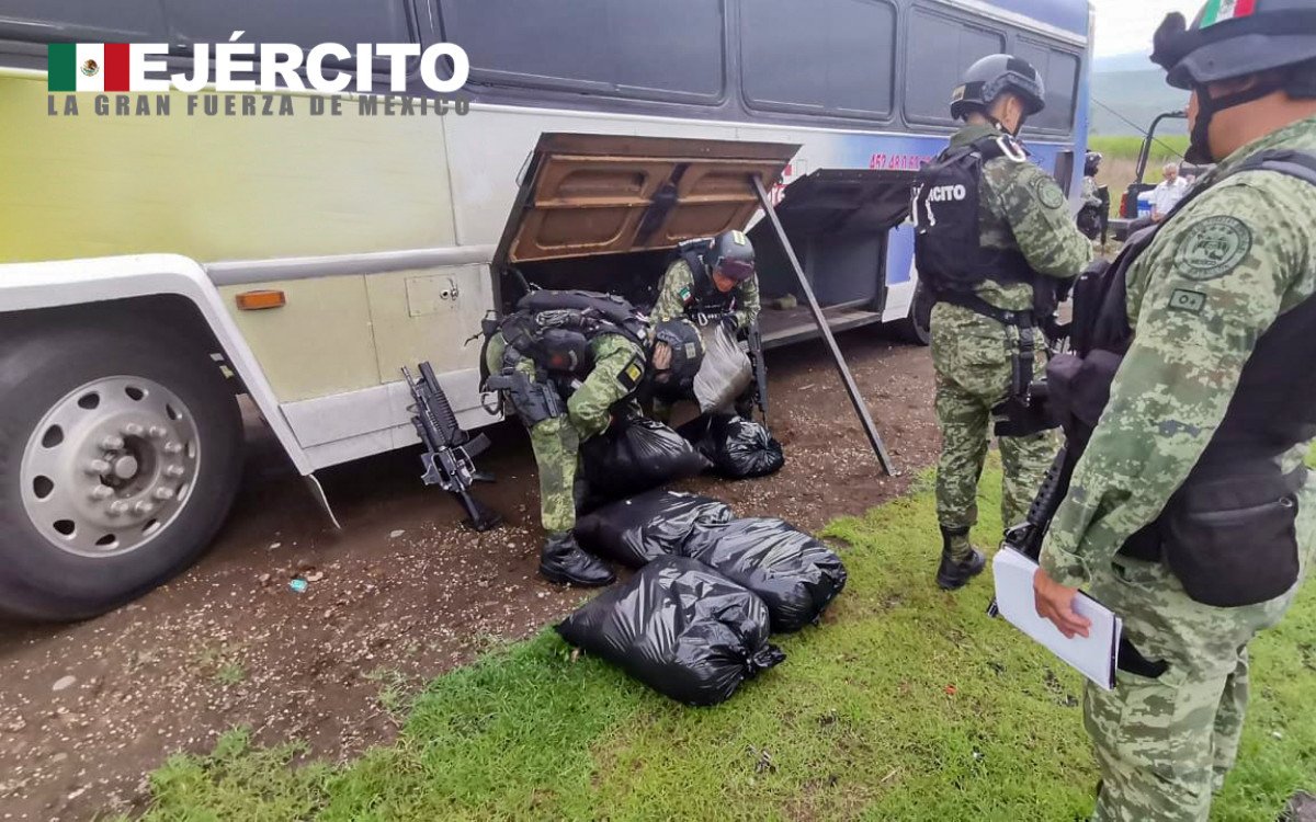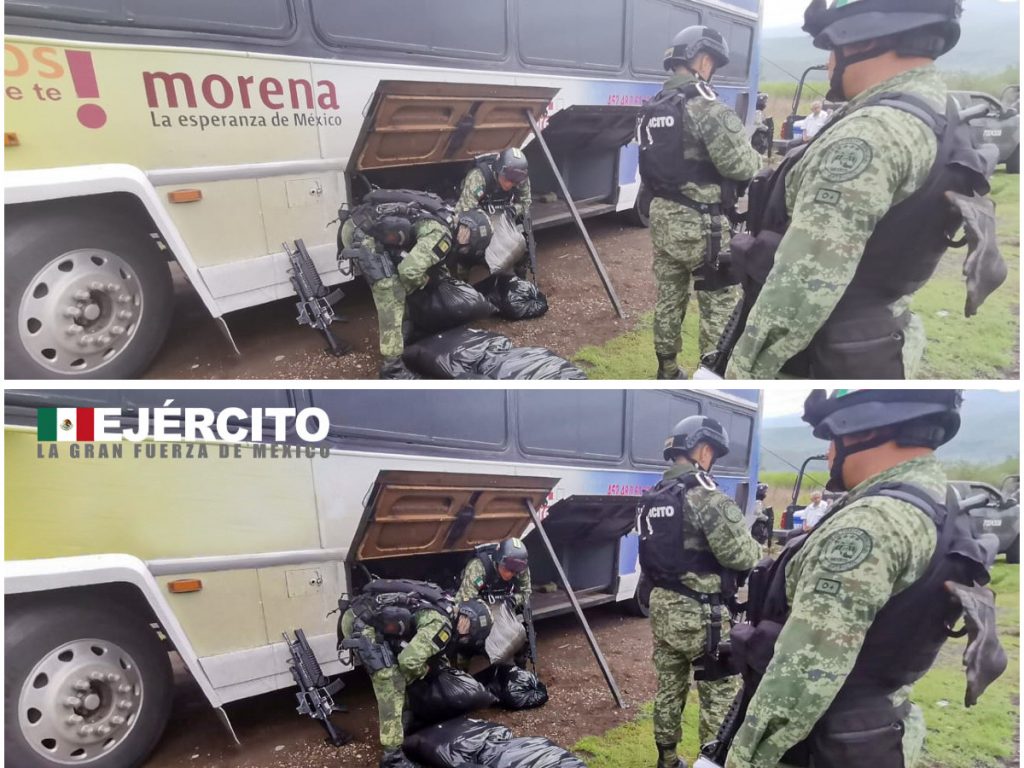 La Secretaría de la Defensa Nacional (Sedena) difundió fotografías de un decomiso de drogas en Michoacán. Sin embargo, las imágenes originales fueron alteradas para eliminar el logo de Morena que aparece en el autobús en el que se trasportaban 280 kilogramos de una sustancia con características similares a las del cristal.