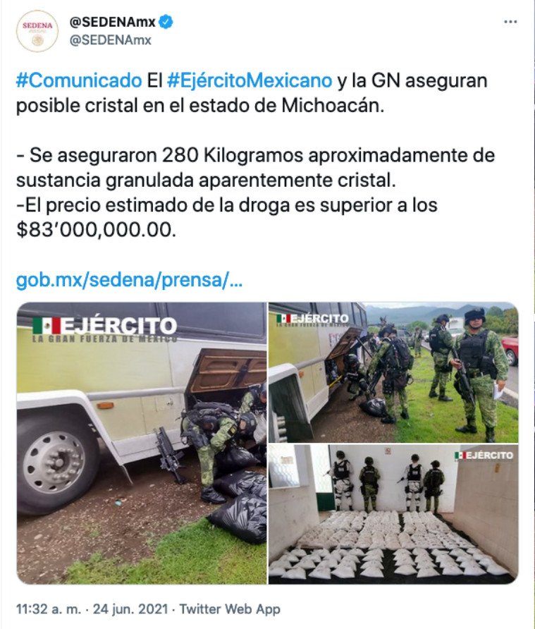 La mañana del 24 de junio, Sedena compartió a través de Twitter el informe del operativo realizado un día antes, en el marco Plan Nacional de Paz y Seguridad 2018-2024 como parte de la Estrategia Nacional de Prevención de Adicciones “Juntos por la Paz”.