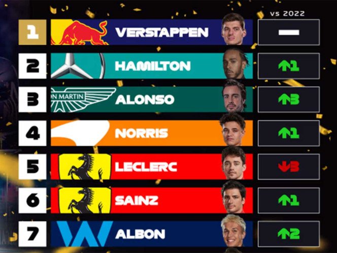 Además, se destacó el desempeño de otros pilotos como Lando Norris y Charles Leclerc, mientras que Carlos Sainz, a pesar de haber sido el único capaz de arrebatar una victoria a los Red Bull durante el Mundial, ocupó el sexto lugar en esta votación.