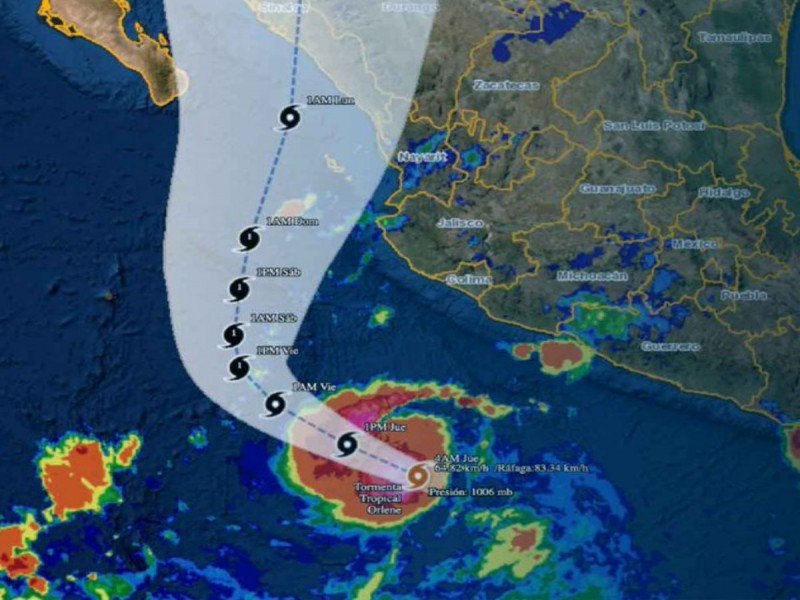 Se prevé que la tormenta tropical se convierta en huracán categoría 1 el viernes frente a las costas de Jalisco, Nayarit, Colima y Sinaloa, estado al que Orlene podría llegar como tormenta tropical, nuevamente, entre el lunes y martes de la próxima semana.