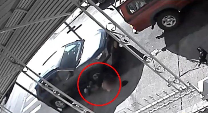 Posteriormente, se ve cómo el sujeto se le monta a la mujer sobre la acera detrás de un automóvil estacionado, mientras el perro de la victima de raza chihuahua ladra furioso.